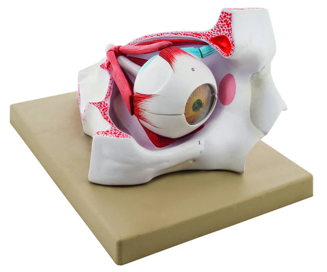 Enlarged 3 times life size, this model includes a dissectible eye and the bony orbit of the skull. The upper half eye ball is removable and dissects into 6 parts showing all anatomical details. Shows the six muscles controlling the eyeball two are removable, to help better understand vision and eye movement. Mounted on a base, size is 12"L x 9H x 7"W. Included key card with 18 call outs.