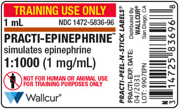 The Wallcur Practi-Epinephrine™ Peel-N-Stick Label, for clinical training, accurately simulates 1 mg/1 mL of epinephrine (Adrenalin®). Each Practi-Epinephrine™ label peels and adheres to our 1 mL Practi-Ampules™, instantly changing the drug and dosage.