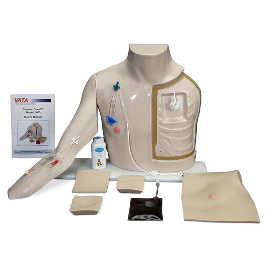 VATA Inc.’s Chester Chest™ has been an industry standard in healthcare simulation since 1986 for the teaching of central line care. Chester Chest™ features a standard arm with a dual lumen 5FR PICC exiting the basilic vein from the inner bicep area and a pre-positioned 20g IV catheter in the forearm. Chester Chest™ makes it possible to teach and practice the infusion, withdrawal, care, securement and dressings of the following vascular access lines: IVAD placed in the chest, Hickman-like central line, PICC line, IV site and optional Triple lumen jugular and subclavian catheters. With this model, it is possible to simulate accessing the following IVAD placements: normal, “tipping”, “wandering”, or deeply placed. Successful access is confirmed by a blood return. Fluid can be infused and blood withdrawn from all the lines.