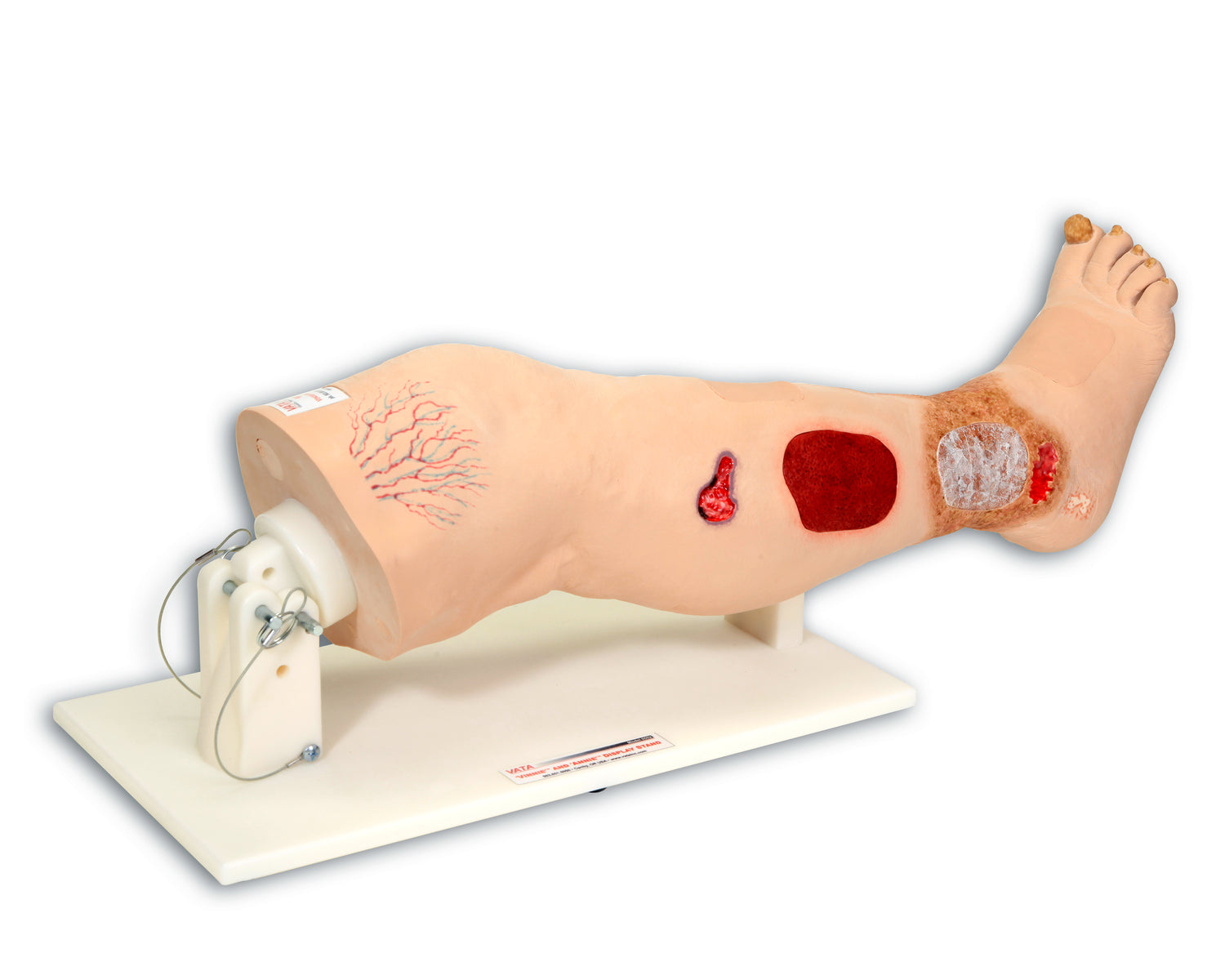 Vinnie Venous Insufficiency Leg™ was molded from an actual patient for true-to-life realism. The following conditions* are presented: Venous Ulcers, Cellulitis, Stasis Dermatitis, Varicose Veins, Hemosiderin Staining, Vasculitis, Lipodermatosclerosis, Calciphylaxis, Pyoderma Grangrenosum, Healed Foot Ulcer, Fungal Thickened Toenails, Maceration, Diabetic Ulcer, Atrophie Blanche, Pitting Edema, Reticular and Telangiectasia Veins. The top of the leg model has a unique molded-in swivel fixture that permits the leg to be rotated a full 360 degrees for easy visualization.