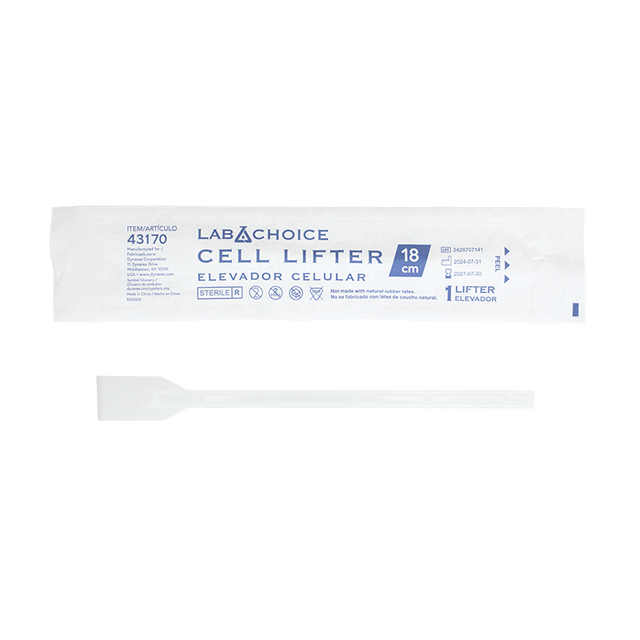 LabChoice Cell Lifters are designed for gentle, precise cell retrieval. The lifters feature an angled, carved blade for reduced cell damage and a sturdy handle for optimal functionality.LabChoice Cell Lifters are crafted for the delicate retrieval and harvesting of cultured cells from a wide range of dish types. These sterile lifters incorporate a slanted, chiseled blade designed to minimize the risk of cell damage. The cell lifters feature a smooth, sturdy polyethylene handle for enhanced durability.