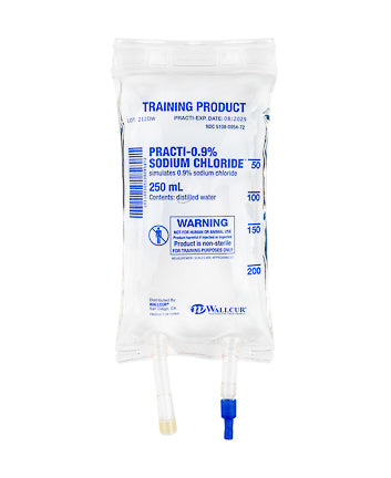 Our Practi-0.9% Sodium Chloride™ 250 mL I.V. Solution Bag, for clinical training, contains distilled water. A perfect IV administration simulation for your nursing, pharmacy, EMT or other allied health skills laboratories. NO PRESCRIPTION NEEDED.