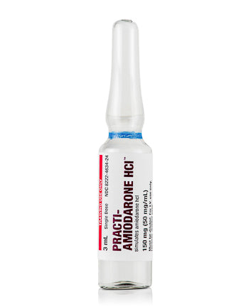 Practi-Amiodarone HCl™ 3 mL Amp for clinical training. Teach your students the complex skills related to the use of the cardiovascular drug, amiodarone hydrochloride (Cordarone®) with Practi-Amiodarone HCl. This 3 mL clear amp accurately simulates the drug amiodarone HCl (Cordarone®) an anti-arrhythmic agent for frequently recurring ventricular fibrillation (VF) and ventricular tachycardia (VT.) Nursing, EMS, EMT and Paramedic students learn a variety of skills including sterile techniques of ampule handling, correct dosage aspiration and needle withdrawal skills. Labeled 150 mg (50 mg/mL.) Contents: distilled water. Manikin safe.