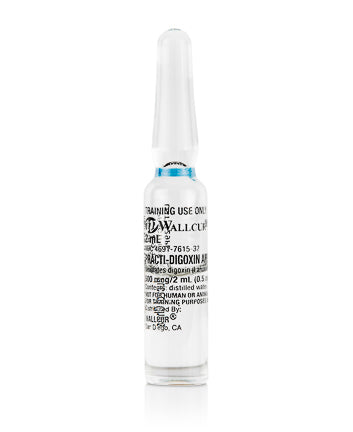 Manufactured for safety and consistency, each Practi-Ampule is chemically scored at the neck for ease in breakage without injury. Health occupational curricula, such as nursing, pharmacy tech, and emergency tech programs will find the Practi-Digoxin Ampule the most authentic practice available.