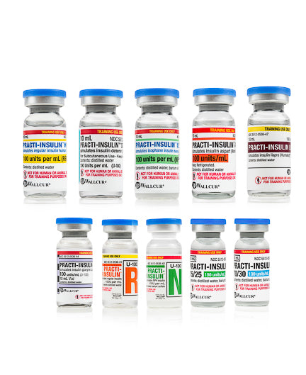 Practi-Insulin Starter Pack™ for clinical training. A Wallcur Exclusive! Teach insulin injection techniques, mixing and combining of short and long acting insulin, and dosage calculation skills with this comprehensive teaching aid. Wallcur’s Practi-Insulin Starter Pack™ contains each of our Practi-Insulin™ vials.